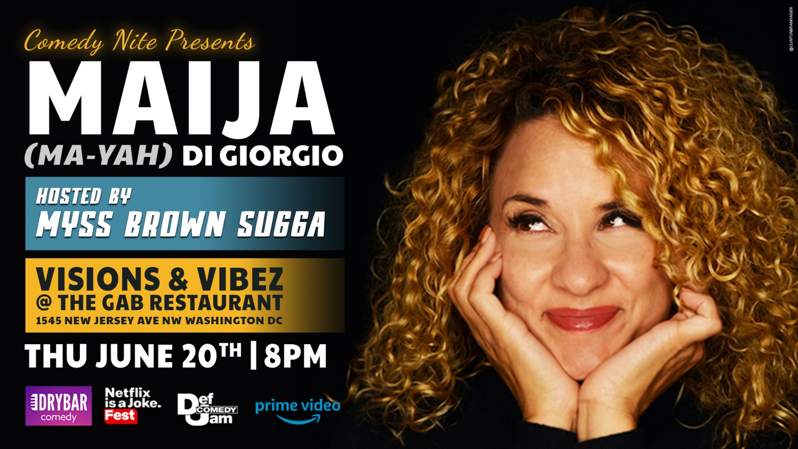 Visions and Vibez @ The Gab Restaurant 1545 New Jersey Ave NW Washington DC … Thursday Nite Comedy presents “MAIJA DI Giorgio” hosted by Myss Brown Sugga